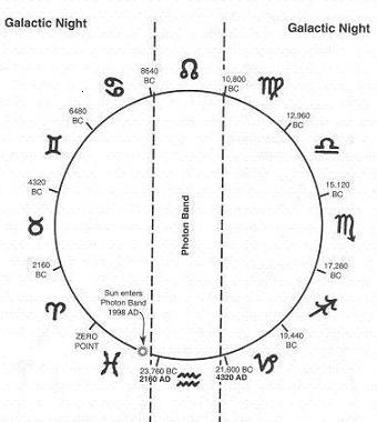 在銀河中運行的地球,大部份的時間是處在銀河黑夜期(Galactic Night)。大約每隔二萬六千年,進入寶瓶座紀元時,地球便開始進入光子帶。事實上,地球只有在獅子座與寶瓶座時代才進入光子帶,其餘的時間都在銀河黑夜期。許多在銀河黑夜期可以隱藏的事物,進入光子帶之後,便無藏身之地,如果我們不能與光的頻率,光的思想意識,光的較高智慧也就是宇宙智慧和諧共振,無論是生活上,身體上或精神上,都很容易產生許多問題。