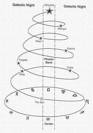 處於銀河黑夜時期,地球的光來自我們太陽系的太陽,是一般所謂的陽光。進入光子帶,指的是進入一個充滿更多光量子的地帶。它是第七次元的環形光,由銀河中心的垂直軸心散發出來。它從銀河星系中心點不停地旋轉,進入銀河黑夜的黑暗中。圖中顯示的是光子帶的光如何從第七次元散發到整個銀河星系中。