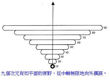 資料顯示,當能量向下移動,經由不同次元逐步遞減時,它便越來越形成稠密的物質,直到它進入鐵核心水晶。同時,當它經由銀河中心逐步向上移動時,那一次元的平面磁場的空間便擴展的越來越大。(圖5.2)。